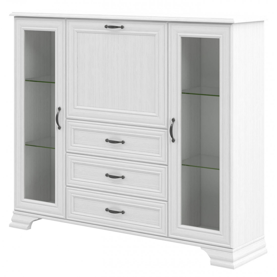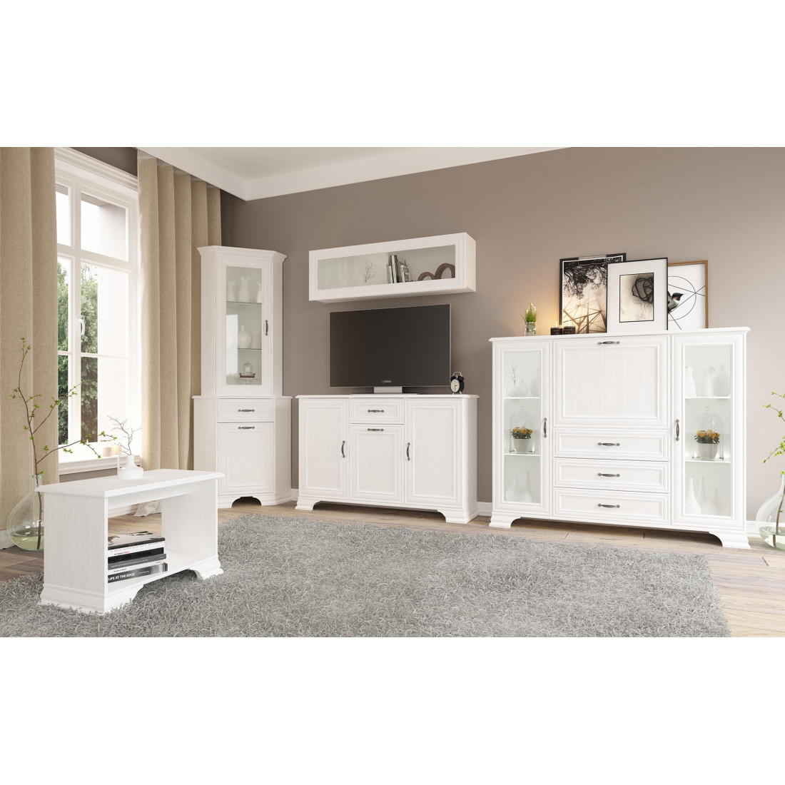 Мебель для гостиной Юнона композиция 3 от фабрики Мебель-Неман - это новинка 2019 года в классическом стиле с отделкой структурной фактуры, обрамленная рамочным фасадом, где металлические ручки выгодно подчёркивают стиль и изящество, всегда актуальна и востребована. Полки у шкафа-витрины и тумбы - стеклянные.