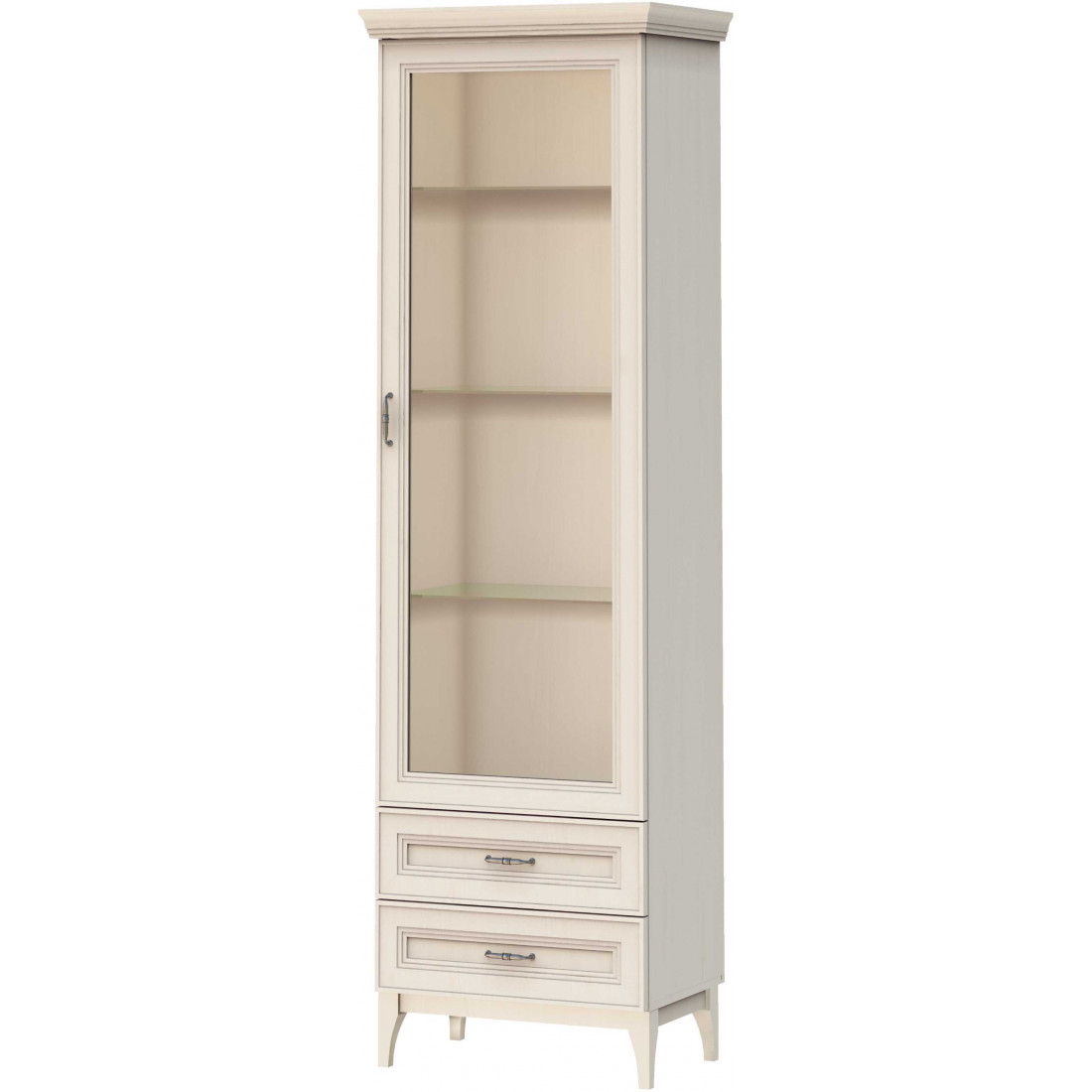 -верхнее отделение: фасад распашной рамочный со вставкой из прозрачного стекла 4 мм в паз. За фасадом три стекло-полки толщ. 6 мм;