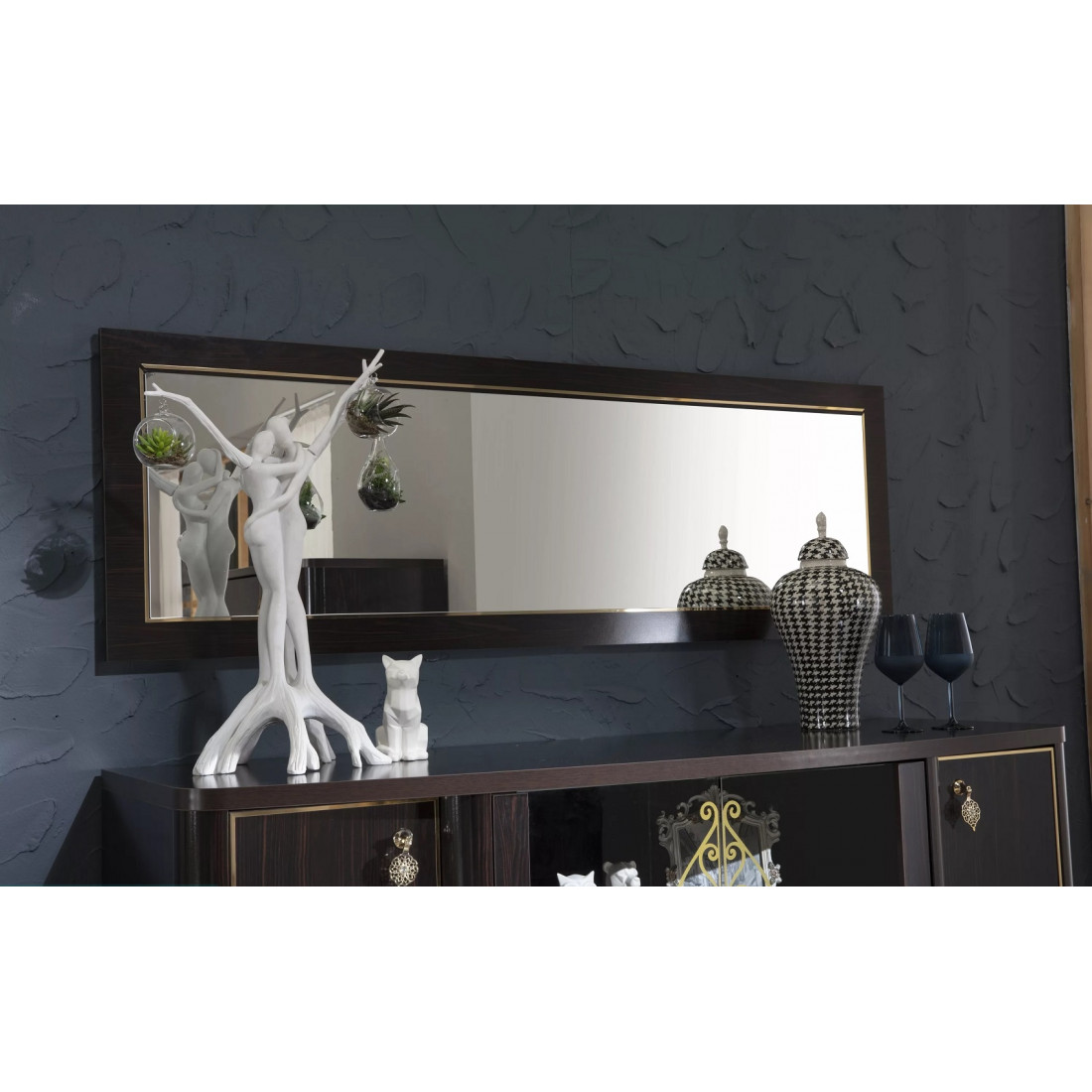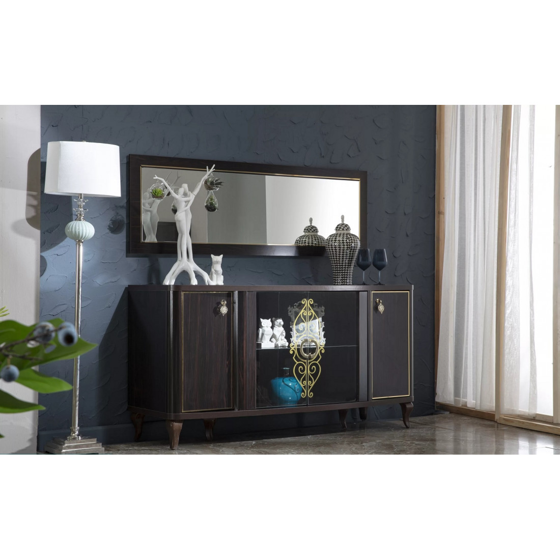 Зеркало для буфета "Легенда" обладает элегантным утонченным стилем. Оно представлено в виде прямоугольного основания и такого же прямоугольного зеркала с декоративной золотой отделкой. Благодаря такому минимализму, изделие можно использовать не только вместе с буфетом, оно прекрасно впишется и как отдельный предмет интерьера практически в любую комнату.